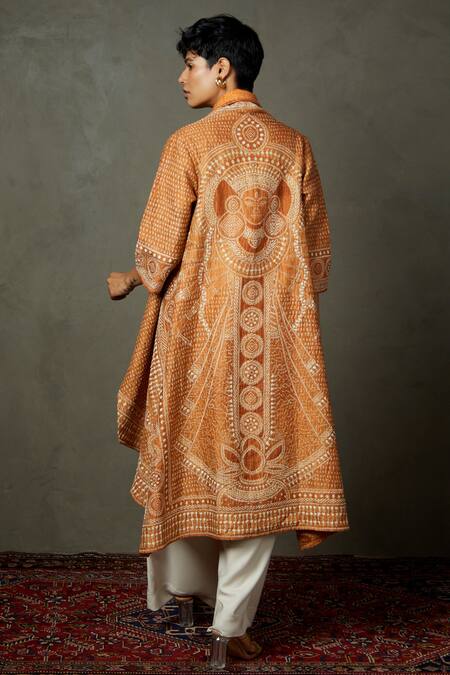 Kantha thread embroidered geometric patterns, Printed inner lining, Open front design
