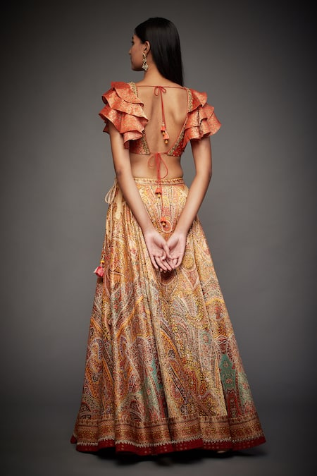 Burnt orange brocade jamawar lehenga with all-over multi-color motifs. Comes with layered ruffle sleeve blouse.