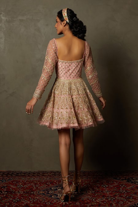Pink dress featuring a sweetheart neckline and full sleeves with intricate floral and geometric embroidery using gota work