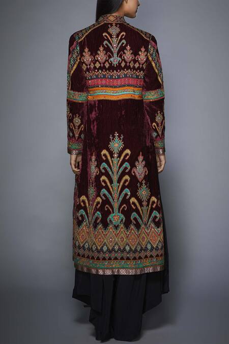 Black & burgundy long jacket with all over kashida embroidery.