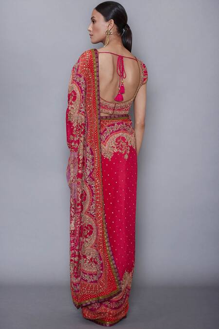 Red & pink saree with all over floral motif & embroidery. Comes with unstitched blouse fabric.