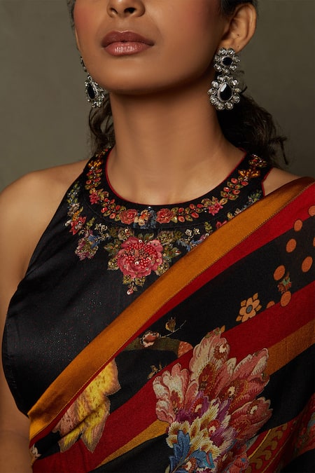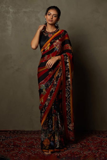 RI.Ritu Kumar_Black 100% Silk Floral, Stripe Round Embroidered Saree With Blouse _Online_at_Aza_Fashions