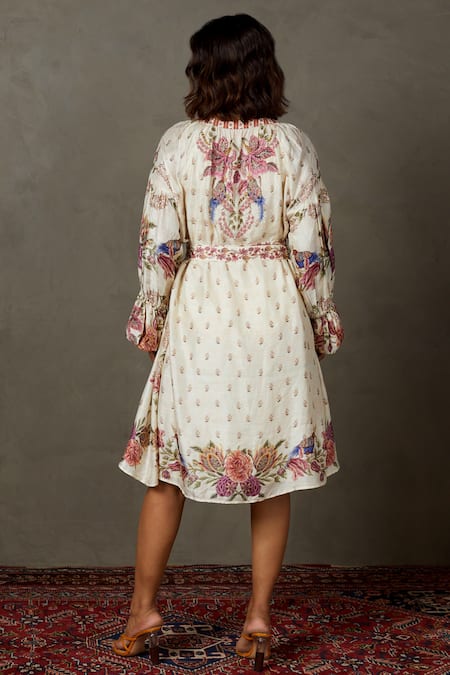 Off White Murshidabad Silk Dt Printed And Hand Embroidered Floral Tropical Dress