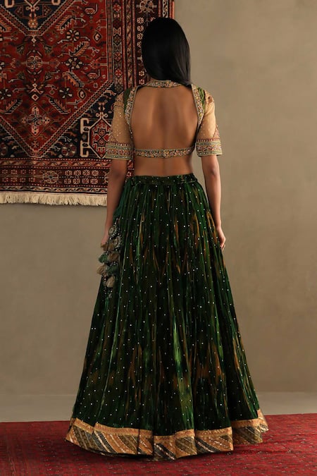 Cut-out blouse back, Thread embroidered border, Sequin detailing on lehenga