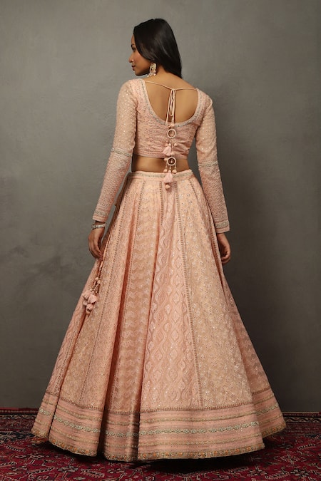 Pink lehenga featuring tonal geometric, thread, and sequin hand embroidery. Paired with a coordinating blouse and dupatta.