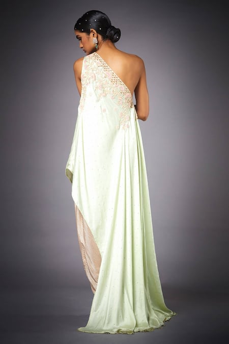 Pista green one shoulder cape with thread work embroidered floral motifs. PAired with gold draped dhoti pant.