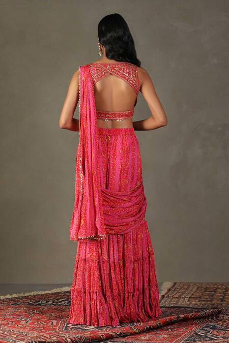 Pink pre-draped pant saree featuring bougainvillea prints and tiered design. Paired with a sleeveless blouse embellished with aari and tikki embroidery.