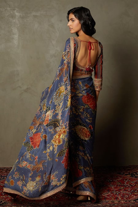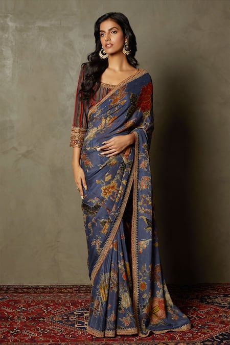 Blue saree featuring romantic flower print with contrast hem. Comes with unstitched blouse fabric in rayon crepe.