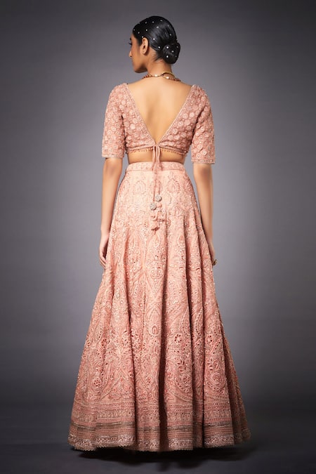 Peach lehenga with all-over floral motif thread-bead work. Comes with crystal tassel hem blouse & embellished dupatta.
