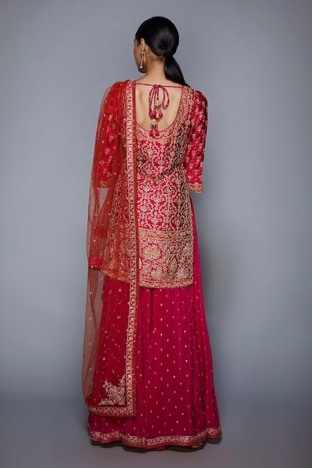 Fuchsia & orange straight short kurta with all-over Mughal - floral embroidered motifs. Comes with flared pants & contrast dupatta.
