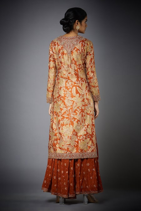 Beige and orange kurta featuring notched neckline, long sleeves, and intricate zardozi, sequin, and thread embroidery. Paired with a gharara and dupatta, enhancing its elegance.