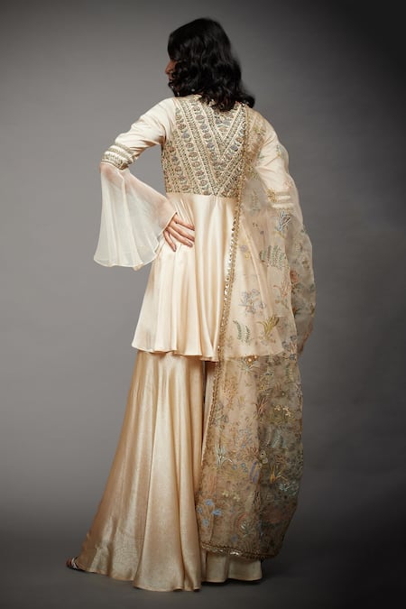 Ivory peplum short kurta with placement floral motif work, panelled sheer bell sleeves & plunging neck. Comes with gharara pants & embroidered dupatta.