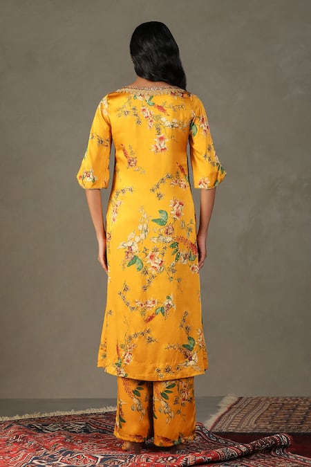 Mustard yellow kurta featuring three fourth sleeves, round neckline, and all-over water lily print with sequin embellishments. Paired with printed pants that complement the kurta design.