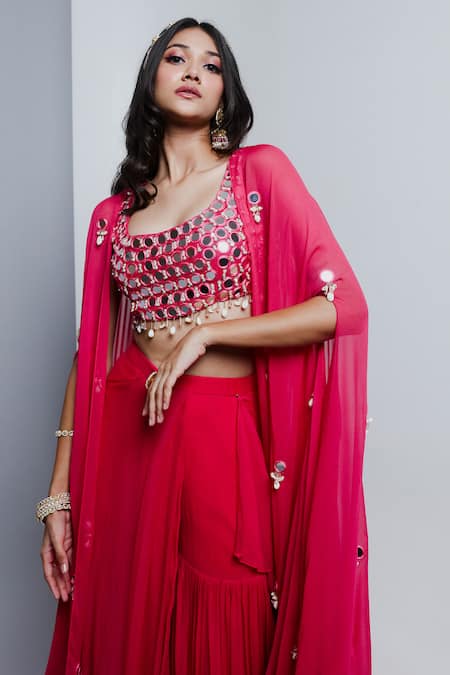 Fuchsia pink cape featuring slit sleeves and cowrie shell embellishments. Paired with a sleeveless padded blouse adorned with mirror work and dangling glass beads, complemented by a draped tiered sharara.
