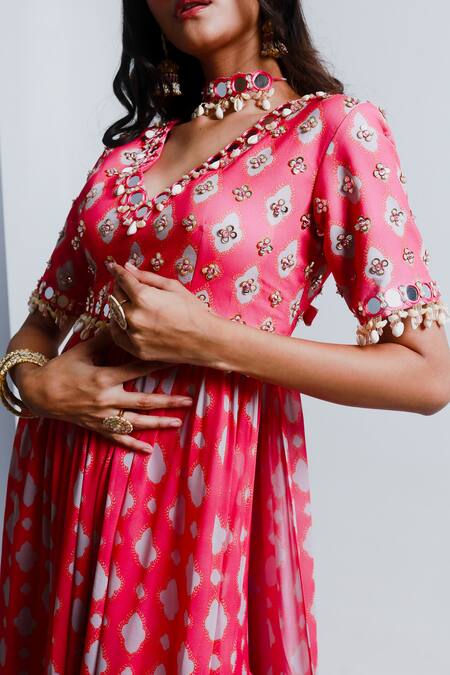 Fuchsia pink long top featuring a V neck, half sleeves, and a back tie-up. Paired with a matching tiered sharara, both adorned with floral sequin embellishments and cowrie detailing.