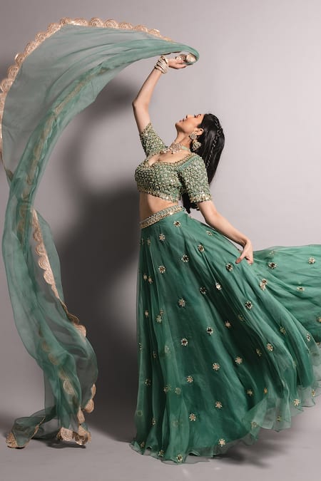 Green embroidered lehenga featuring floral motifs and scallop border detailing. Paired with a heavy embroidered padded blouse and an organza dupatta.