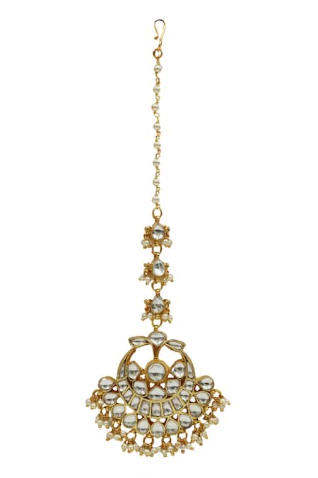 Gold maangtikka featuring carved motifs, cutwork detailing, and multi bead drops