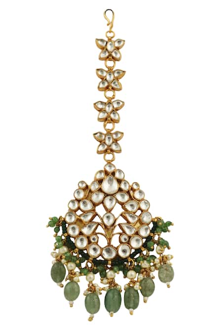 Gold and green maangtikka featuring carved motifs and multi bead drops