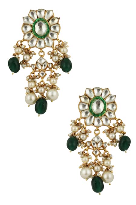 Gold dangler earrings featuring floral carved top with cluster bead drops and cutwork detailing