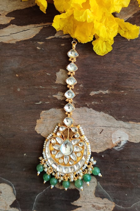 Gold maangtikka featuring encrusted stones and green bead drops