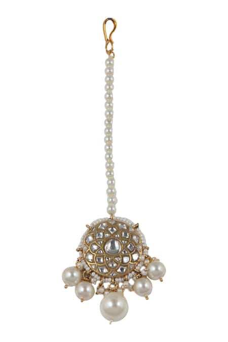 Gold maangtikka featuring a circular drop design with embellished pearls and floral motifs