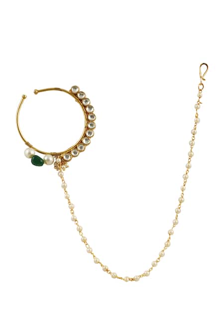 Gold nose ring featuring beaded embellishments with white round stones and green beads