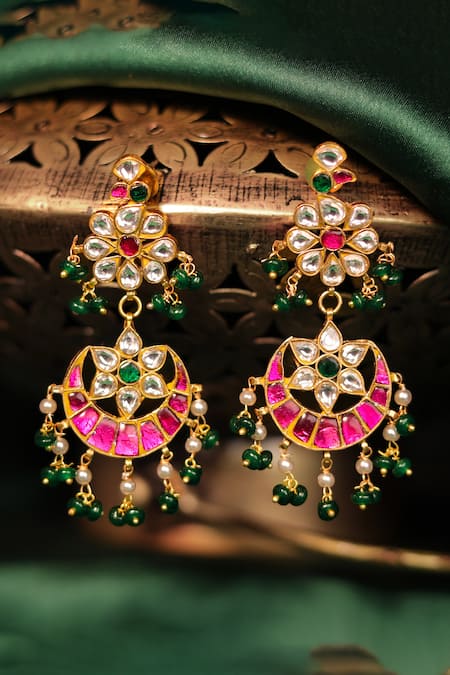 22kt matte gold plated chand noor jewellery set featuring long pendant necklace, choker necklace, and earrings. Embellished with green, pink, and white toned kundan and pearl details.
