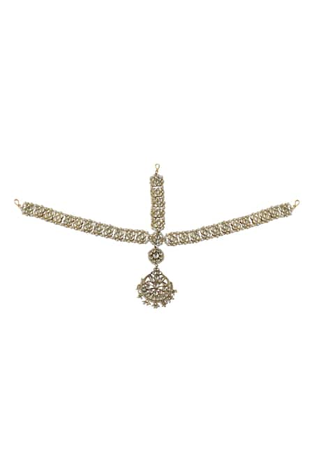 Gold maangtikka featuring floral motifs with a chandbali drop, embellished with pearls and encrusted jadtar stones