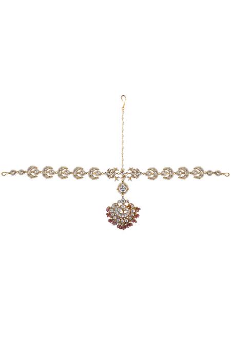 22kt gold plated mathapatti featuring a crescent moon design embellished with semi-precious pearls and jadtar stones