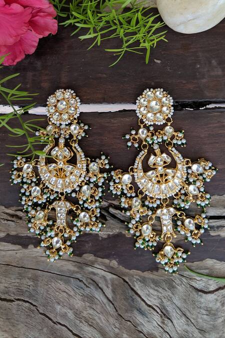 Gold chandbalis featuring encrusted stones, floral top, and cluster bead drops. Designed with inverted teardrop motifs and crafted from a silver and copper mix.