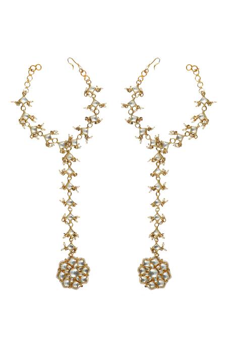 Gold hathphools featuring tiered geometric strings and floral motifs. Adorned with cluster pearls and encrusted jadtar stones, crafted from a silver and copper mix.