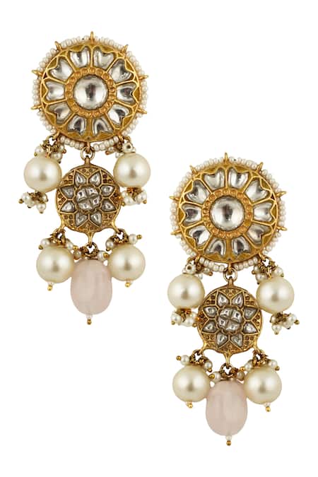Gold Plated Glitter, Pearls, Stones Floral Carved Dangler Earrings