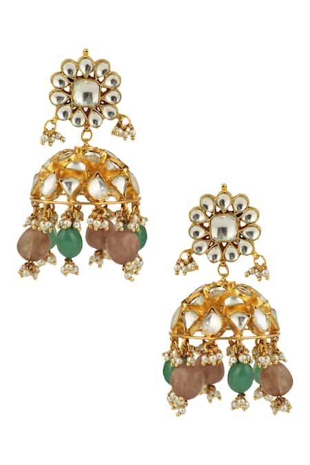 Gold jhumka earrings featuring floral carved tops, cutwork detailing, and cluster bead drops