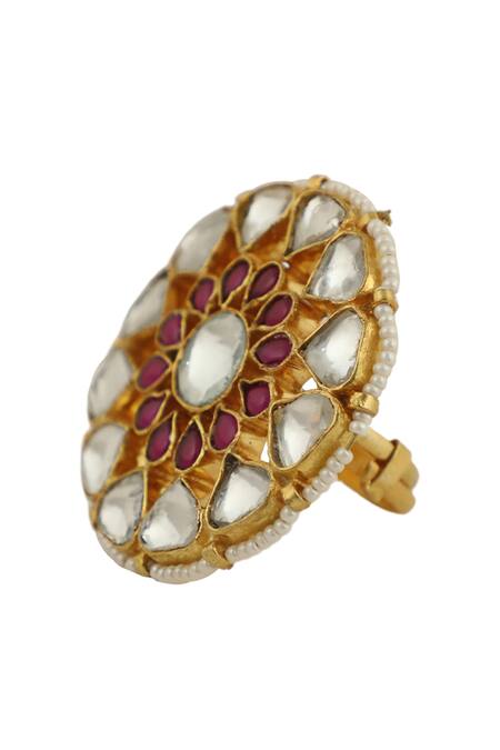 Gold floral carved adjustable ring featuring cutwork detailing and studded with real jadtar stones