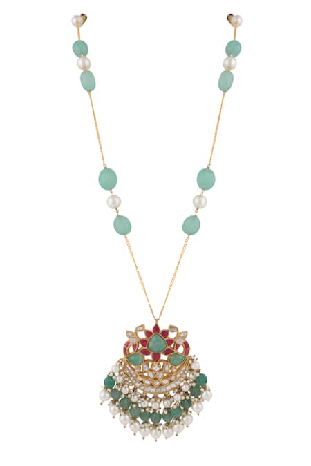 Drop tassel details on the necklace, Floral pattern in the pendant, Use of semi-precious stones