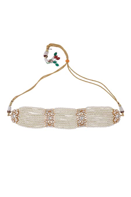 White choker necklace featuring floral geometric cut work with jadtar stones and pearl layered chains. Paired with embellished stud earrings in a matching design.