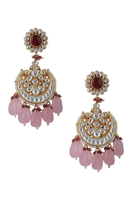 Floral motif chandbali earrings featuring real jadtar stones, semi-precious pearl embellishments, and pink glass bead drops