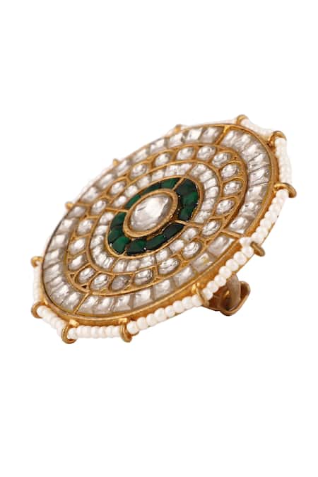 Green embellished floral pattern ring featuring jadtar stones, pearls, and glass beads