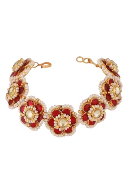 Red Beads, Pearls, Stones Floral And Ruby Embellished Bracelet