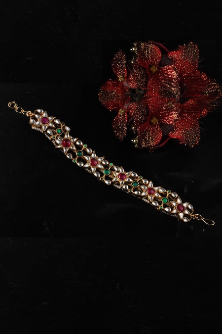 Gold bracelet featuring encrusted multi-color stones and cutwork details