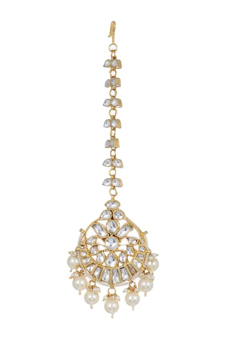Gold maangtikka featuring a floral motif center with encrusted stones and cutwork detail