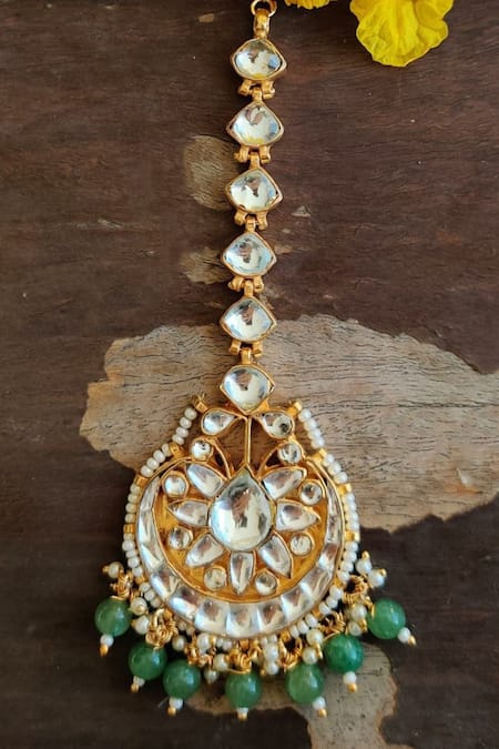 Gold maangtikka featuring a floral motif center with encrusted stones and green bead drops