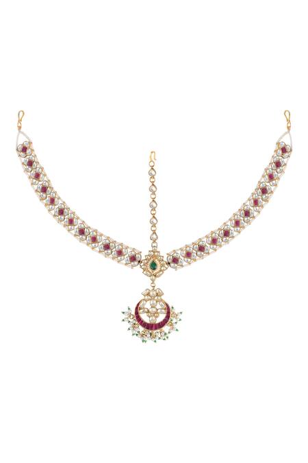 Gold mathapatti featuring a floral motif centre and a crescent moon drop