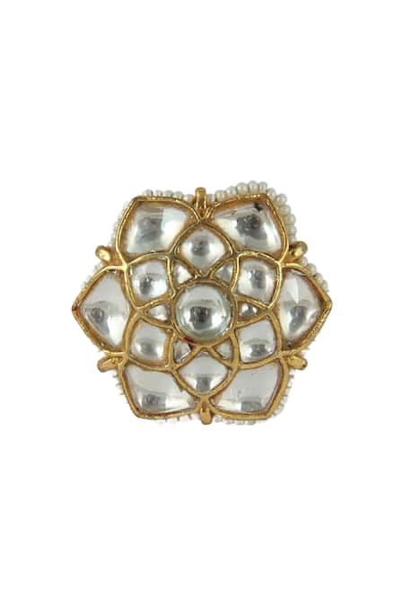 Gold adjustable ring featuring a floral design embellished with pearls and encrusted jadtar stones