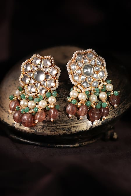 22kt matte gold plated flower earrings featuring real jadtar stones, pink glass beads, and semi-precious pearl tassels
