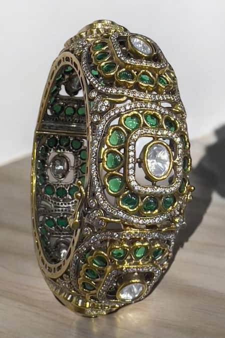 Green stone embellished cutwork kada featuring intricate detailing and an adjustable screw closure