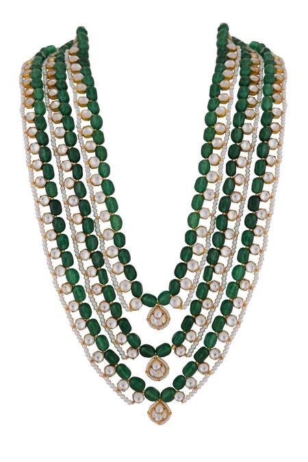 Green Jade Bead And Jadtar Stone Embellished Layered Long Maharani Necklace
