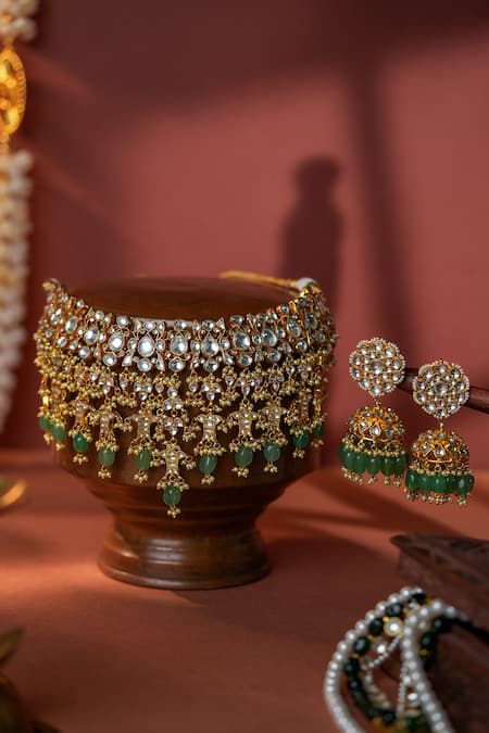 Intricate pearl detailing on necklace, Jhumki earrings with green accents, Adjustable dori closure for a perfect fit