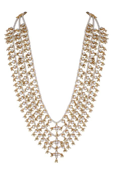 White mala featuring three lines embellished with jadtar stones and pearl drops