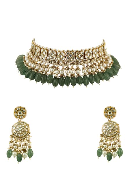 22kt gold plated choker featuring white jadtar stones and sea green beads. Accompanied by floral motif drop earrings with stone drops.